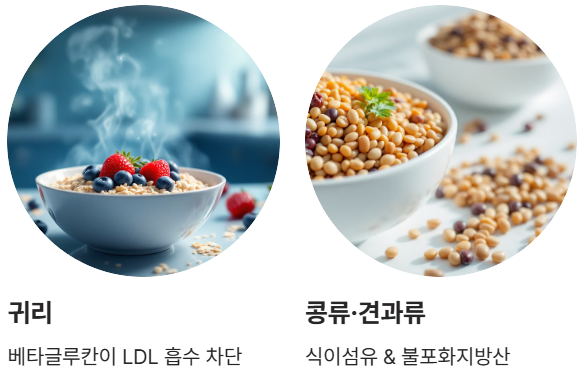 - 식이섬유 폭발 식단: 귀리(베타글루칸), 콩류, 채소를 매 끼니 포함하여 LDL 흡수 자체를 차단하세요.