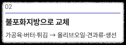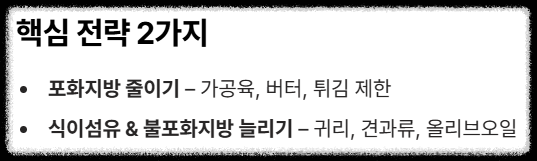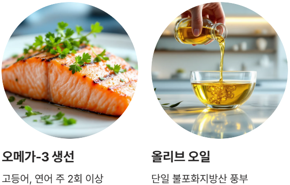 - 불포화지방으로 교체: 포화지방(가공육, 버터, 튀김)을 줄이고 불포화지방(올리브 오일, 견과류, 생선)으로 대체하세요.