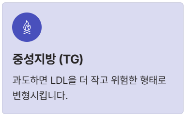 - 중성지방 (Triglyceride, TG): 우리가 먹은 음식 중 쓰고 남은 에너지를 저장하는 형태입니다. 과도한 중성지방은 LDL을 더 작고 밀도가 높은 (더 위험한) 형태로 만들어요.