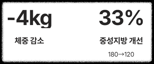 - 체중/중성지방 변화: 체중 4kg 감소, 중성지방(TG) 180 → 120 mg/dL로 개선.