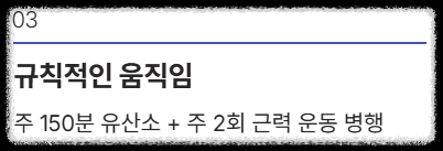 - 실천: 매일 점심 후 30분 빠르게 걷기 + 주 5회 저녁 식단 (오트밀, 샐러드, 닭가슴살 위주)