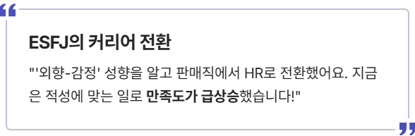 "**ESFJ**인 저는 늘 '타인을 돕는 일'을 하고 싶었지만, 마냥 흥미가 없던 판매직에 있었어요. 제 성격이 '외향-감정'에 기반한다는 걸 알고, 사람들의 성장을 돕는 HR(인사) 직무로 용기 내어 전환했습니다. 지금은 제 적성에 딱 맞는 일을 하면서 엄청난 만족도를 느끼고 있어요!"