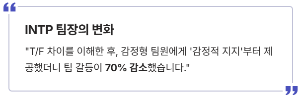 "저는 INTP 팀장이에요. 예전엔 감정형(F) 팀원들이 논리적인 제 말에 왜 힘들어하는지 이해가 안 됐죠. 하지만 **MBTI 4가지 지표** 중 T/F 차이를 이해한 후, 보고할 때 '감정적 지지'부터 제공했어요. 그 결과, 팀 내 인간관계 갈등이 70% 이상 줄었고, 팀 사기가 눈에 띄게 올랐습니다."