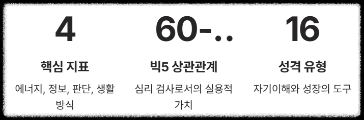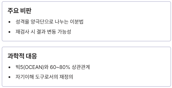 - 심리학적 유효성: **MBTI 비판**에도 불구하고, 빅5와의 높은 상관관계(60~80%)는 **심리 검사**로서의 실용적 가치를 뒷받침합니다.