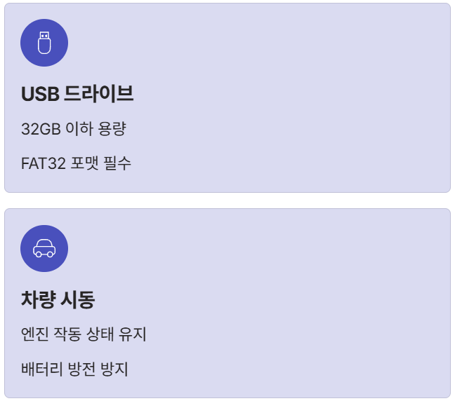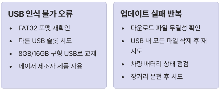 - **3. 업데이트 전 시동 끄고 재시동:** USB를 꽂기 직전에 시동을 끄고, 다시 시동을 걸어 시스템을 초기화한 후 USB를 꽂으면 인식 오류가 줄어든다는 꿀팁이 있습니다.