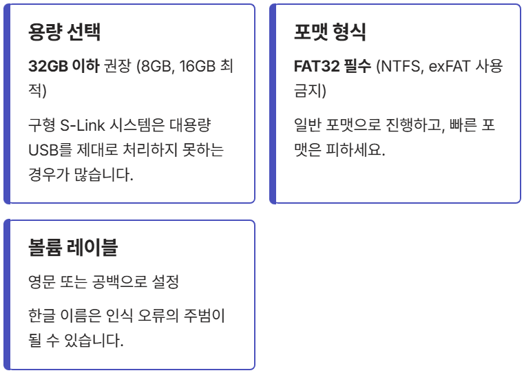 왜 32GB를 넘으면 안 되냐고요? 구형 S-Link 시스템은 대용량 USB 메모리를 제대로 처리하지 못하는 경우가 많기 때문이에요. 포맷은 반드시 FAT32로 통일해 주세요.