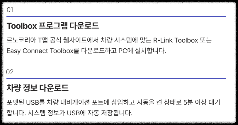 - [1단계] 르노코리아 T 맵 공식 웹사이트에 접속: 르노코리아 T맵 공식 웹사이트 내비게이션 업데이트 페이지에 접속합니다. 차량 시스템에 맞는 **R-Link Toolbox 또는 Easy Connect Toolbox**를 다운로드하고 PC에 설치합니다.